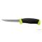 Le manche a une construction avec un noyau en TPE entouré de caoutchouc. Cela permet une excellente prise en main même avec les mains mouillées. Cette combinaison de matériaux a depuis longtemps fait ses preuves au sein de la gamme Companion. Elle est en acier inoxydable suédois. Mora a une excellente connaissance du traitement thermique nécessaire à la fabrication d’une lame solide tout en étant flexible et garantissant une bonne conservation du tranchant.