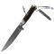 Couteau Nicker multifonctions bois de cerf au style traditionnel équipé d’une lame fixe de 11cm, d’une scie avec décapsuleur, d’une lame à éviscérer et d’un tire-bouchon. Le couteau est fourni avec un étui en cuir avec passant de ceinture. La lame principale est fixe et les 2 autres lames sont pliantes.