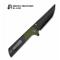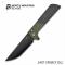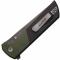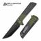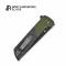 Le manche combine l'élégance de la Manche Fibre de Carbone avec la robustesse de l'Aluminium 7075 peint en vert mat. La structure interne en aluminium est usinée CNC et largement évidée pour un gain de poids maximal, ce qui permet à ce couteau d'atteindre seulement 90 g. L'ouverture est assurée par le Flipper et le verrouillage par le mécanisme fiable Buttonlock.