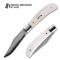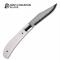 Le manche est une véritable œuvre d'art, composé de plaquettes en Os de Bétail (Cattle Bone) sélectionné, offrant une texture naturelle et une patine unique qui s'embellira avec le temps. Les mitres (bolsters) en acier inoxydable apportent une solidité classique et un équilibre parfait à l'ensemble. En tant que Slipjoint, ce couteau ne possède pas de verrouillage mécanique mais un ressort dorsal (Backspring) ferme et sécurisant, ce qui en fait un compagnon idéal pour une utilisation quotidienne élégante et conforme à la plupart des législations. Avec ses finitions faites main, le Lanny de North Mountain Blade est une pièce de collection destinée aux amateurs de belle mécanique traditionnelle.