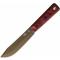 Le manche est composé de plaquettes en Manche Red Canvas Micarta, sublimées par des liserés orange (Orange liners) qui ajoutent une touche de visibilité et de style. La construction Full Tang (pleine soie) garantit une solidité à toute épreuve, renforcée par l'expertise de fabrication de TOPS Knives. D'une longueur totale de 26,04 cm, ce couteau est livré avec une Housse cuir (étui de ceinture en cuir marron) de qualité premium.