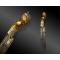 Lame en acier, courbe, à simple tranchant, avec gouttières incrustées de laiton gravé d’une frise ; sur chacun des côtés, un cartouche gravé est orné d’une frise en laiton et d’une pièce d’argent à décor en repoussé.