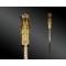 La poignée en ivoire marin est finement sculptée de motifs végétaux à plusieurs degrés et ponctuées de rivets. Mitre en argent à décor en repoussé.
