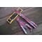 Longueur ouvert : 22,5 cm. Poids : 105 g. Lame tranchante en acier inoxydable de 10 cm colorée. Manche antidérapant en acier coloré, dépliable en deux. Verrouillage sécurité et clip ceinture sur le manche.