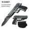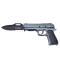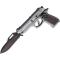 Système à ouverture assistée. Longueur fermé 13.97cm. Longueur de lame 8.89cm. Lame de type sperar point partiellement serrated. Lame en acier 420C. Plaquettes du manche en aluminium gray. Manche forme de pistolet. Ouverture d'une main avec le thumb hole. Linerlock. Etui nylon noir.