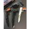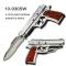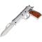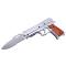 Système à ouverture assistée. Longueur fermé 13.97cm. Longueur de lame 8.89cm. Lame de type spear point finition stonewash. Lame en acier 420C. Manche Silver aluminium avec crosse orange G10 onlay. Manche en forme de pistolet. Ouverture d'une main avec le thumb hole. Etui nylon noir.