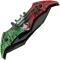 Le Rite Edge Laughing Joker est un couteau pliant à ouverture assistée doté de deux lames courbes en acier inoxydable avec une finition noire. Son manche en aluminium rouge et vert présente un motif imprimé en 3D représentant le Joker. L'ouverture se fait par le pouce (thumb pull) et le couteau est équipé d'un clip de poche. Le verrouillage est de type Liner Lock.