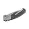 Le manche, alliant acier, carbone et titane, présente une finition élégante en gris, assurant à la fois robustesse et légèreté. La sécurité est renforcée par un système d'ouverture Liner Lock, garantissant une utilisation en toute confiance. Le couteau se transporte facilement grâce à un clip pratique et un étui en feutre.