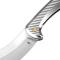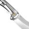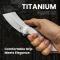 Le Kizer Dawn est doté d'une lame Sheepsfoot de 8,03 cm (3.16 inches) en acier CPM S35VN, un acier en poudre de haute performance reconnu pour son excellent équilibre entre résistance à la corrosion, dureté (atteignant 61-63 HRC) et tenue de coupe exceptionnelle. La lame présente une finition Satin (satinée) classique et son émouture est de type Flat Grind, optimisant la géométrie de coupe. Le manche de 11,66 cm (4.59 inches) est en Titane, avec une finition anodisée qui crée un motif inspiré par les rayons du soleil, offrant des reflets argentés et dorés uniques. Ce matériau, à la fois léger et extrêmement durable, assure une prise en main confortable et sécurisée. Un entretoise (backspacer) texturé ajoute une touche de style et de préhension supplémentaire.