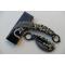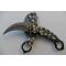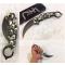 Karambit est un couteau incurvé ressemblant à une griffe. Il a été inspiré par les griffes de grands félins. Il était principalement utilisé comme outil agricole conçu pour ratisser les racines et les plantes de riz. Le karambit de nos jours est utilisé comme arme de défense ou pour les combats rapprochés. Il est facilement dissimulable et peut être porté à l'épaule ou à la ceinture en toute discrétion. Lame 7 cm acier à cran intérieur. Largeur de la lame : 2,5 cm. Manche en alu 14 cm à anneau, avec clip ceinture. Longueur ouvert : 20 cm. Poids : 140 g. Lorsque le couteau est maintenu dans une poche par le clip, en tirant sur l'anneau, extraire le couteau de la poche et ouvrir en même temps la lame (grâce au crochet situé sur le dos de cette dernière). Le couteau dédié aux pêcheurs, bricoleurs, campeurs, sculpteurs, etc... Belle affaire pour collectionneur qui souhaite un très beau couteau de haute qualité, idéal dans une belle collection.