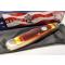 Le manche de 9,53 cm une fois fermé est fabriqué en os Winterbottom Ambre, un matériau distinctif avec un motif jigged qui assure une prise en main ferme et confortable. Les liners en laiton et les mitres et rivets en nickel argenté ajoutent à la robustesse et à l'esthétique classique du couteau. Un bouclier incrusté en nickel argenté arborant le logo Queen complète le design.