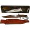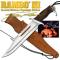 RB9297 Rambo III Stallone Signature. 18" overall. 13" custom large stainless bowie blade with anti-glare sighting slot. Laminated hardwood handles with stainless guard and pommel. Black cord lanyard. Top grain leather sheath with leg tie. Officially licensed reproduction. Limited edition of 10,000.