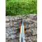 Sont réuni sur ce modèle une lame damas en acier carbone avec découpe EDM (électroérosion) inscrivant un symbole patrimonial français et un manche en corne de bélier muni d'une garde en manche colorée.