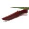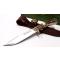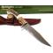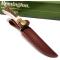 Longueur totale 16.51cm. Longueur de lame 8.26cm. Lame en acier 440. Lame de type clip point finition satin. Garde en laiton. Construction d'une seule pièce. Full tang. Trou dans le manche pour dragonne. Logo incrusté dans le manche. Plaquettes du manche en os façon bois de cerf et bois. Etui Cuir