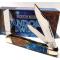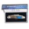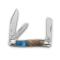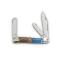 Ses caractéristiques principales incluent trois lames en acier 440 avec une finition satinée : une lame de style Clip Point (la plus longue), une lame Sheepfoot et une lame Spey. Cette combinaison de formes de lame offre une grande flexibilité pour la coupe, le tranchage, les travaux de précision et d'autres usages utilitaires. Le manche est orné de bois et de résine dans un motif Pandora Swirl aux tons bleus et marron clair, offrant une esthétique saisissante et une prise en main confortable. Ce couteau utilise un mécanisme Slip Joint traditionnel pour maintenir les lames en position ouverte.