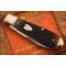 Le Rough Ryder Teardrop Jack est doté d'une lame de 6,9 cm de style pointe de lance avec un tranchant lisse, fabriquée en acier inoxydable 440A. Cet acier, connu pour sa bonne résistance à la corrosion et sa facilité d'aiguisage, présente une dureté de 55-58 HRC. La lame bénéficie d'une superbe finition polie miroir et d'une émouture plate, garantissant une excellente performance de coupe. L'épaisseur de la lame est de 2,8 mm. Le manche de 9,53 cm (longueur fermée) est orné d'os marron quadrillé, offrant une texture agréable et un look intemporel. Les mitres en maillechort et les platines en laiton complètent la construction robuste et élégante de ce couteau.