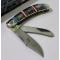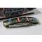 Le manche est une véritable pièce de collection composée de plaquettes en Red and Blue Stone (reconstitution de pierre rouge et bleue de style turquoise). L'ensemble est magnifié par des incrustations en Nickel Silver (maillechort) aux motifs sud-ouest et des mitres richement travaillées. La structure est montée sur des platines en laiton (brass liners), garantissant une longévité exceptionnelle. Ce modèle utilise un mécanisme de verrouillage à cran forcé (Slipjoint), traditionnel et fiable.