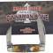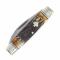 Ce couteau est doté de deux lames en acier Damas magnifiquement texturé, offrant non seulement un aspect visuel saisissant (lames forgées par un processus de fusion de plusieurs couches d'acier) mais aussi une excellente robustesse et rétention du tranchant. Le manche est fabriqué à partir de plaquettes en os de couleur cannelle sculptée (Cinnamon Jigged Bone), offrant une texture riche et chaleureuse. Les traversins (bolsters) en maillechort, les broches et les doublures en laiton (brass pins and liners) complètent cette esthétique classique.