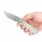 Le manche est équipé de plaquettes en G10 Gris texturé qui offrent une prise en main confortable et antidérapante. Son mécanisme d'ouverture Flipper Invisible, combiné à un pivot sur Roulement à Billes en Céramique, permet un déploiement ultra-rapide et fluide à une main. Le verrouillage est assuré par un mécanisme Liner Lock sécurisé.