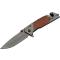 Couteau EDC semi automatique. Longueur ouvert 20.32cm. Longueur fermé 11.43cm. Longueur de lame 8.89cm. Epaisseur de lame 3.5mm. Lame en acier inox finition titane. Lame de type drop point plain edge. Manche en acier avec plaquettes en bois. Fonction brise vitres. Fonction coupe ceintures & brise vitres. Ouverture d'une main avec le flipper & le thumb hole. Système de sécurité linerlock. Clip de poche.