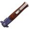 Système à ouverture assistée. Longueur fermé 12,40cm. Longueur de lame 9.53cm. Lame en acier inox Imitation damas blue & red. Manche en bois marron. Mitres en acier. Ouverture d'une main avec le thumb. Trou dans le manche pour dragonne. Clip de poche.