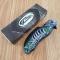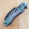 Le manche est une véritable œuvre d'art en ABS sculpté. Il présente un décor en relief représentant un crâne et une colonne vertébrale dans des tons de bleu, vert et rouge (Blue Skull Artwork). La forme du manche est ergonomiquement travaillée avec des évidements simulant une cage thoracique, offrant une prise en main texturée et sécurisante. Le verrouillage est assuré par un système Linerlock fiable. Un clip de poche noir, assorti à la visserie, permet un transport quotidien discret.