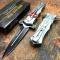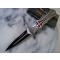 La lame au profil Stiletto est forgée en Lame Acier 440, un acier inoxydable reconnu pour sa grande résistance à la corrosion, parfait pour affronter les conditions du voyage. Elle arbore une finition Two-Tone (Noir et Argent) avec une rainure centrale (fuller groove) qui souligne son aspect racé. Le déploiement est rapide grâce à son ouverture flipper double (double extended "cross" tangs) qui, une fois la lame ouverte, forme une garde protectrice en forme de croix.