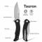 Le manche est composé de plaquettes en G10 Noir, un matériau composite ultra-résistant aux chocs, à l'humidité et aux variations de température. Son ergonomie est particulièrement soignée avec des empreintes de doigts marquées pour une prise en main sûre et confortable, même avec des gants. Le Tauron offre une double option d'ouverture : via l'ouverture flipper ou le Thumb Stud (ergot de pouce), le tout monté sur des roulements à billes en céramique pour une fluidité mécanique irréprochable.