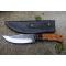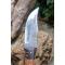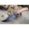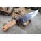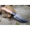 Couteau de chasse Skinner Survie à lame fixe - Longueur totale 22.5cm - Longueur de lame 12cm - Lame en acier carbone 1075 demi brut de forge - Lame type clip point plain edge finition 2 tons - Construction d'une seule pièce - Full tang - Plaquettes du manche en bois - Mitres en bois - Manche & mitres usinées - Etui cuir - Fabrication artisanale