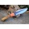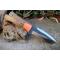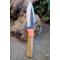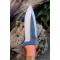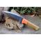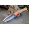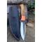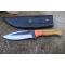 Couteau de chasse Skinner Survie à lame fixe - Longueur totale 22cm - Longueur de lame 11.5cm - Lame en acier carbone 1075 demi brut de forge - Lame type spear point plain edge finition 2 tons - Construction d'une seule pièce - Full tang - Plaquettes du manche en bois - Mitres orange pour ne pas le perdre - Mitres en résine - Etui simili cuir - Fabrication artisanale