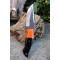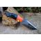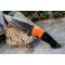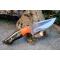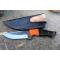 Couteau de chasse Skinner Survie à lame fixe - Longueur totale 20cm - Longueur de lame 9.5cm - Lame en acier carbone 1075 demi brut de forge - Lame type clip point plain edge finition 2 tons modifié harpoon - Construction d'une seule pièce - Full tang - Plaquettes du manche en résine - Mitres orange pour ne pas le perdre - Entretoises en laiton - Trou dans le manche pour dragonne - Mitres en résine - Etui simili cuir - Fabrication artisanale