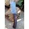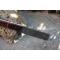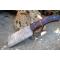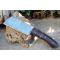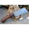 Couteau Damas Skinner 256 couches à lame fixe : Longueur totale 20.5cm. Longueur de lame 10cm. Lame en acier damas 256 couches. Lame construction plate semelle. Lame de type butcher. Dos de la lame guillochée. Plaquettes du manche en bois. Mitres bois. Étui en cuir - Les dessins de la lame sont uniques comme une empreinte - Fabrication artisanale