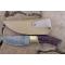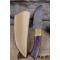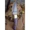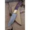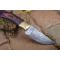 Couteau Damas Skinner 256 couches à lame fixe : Longueur totale 19.5cm. Longueur de lame 9cm. Lame en acier damas 256 couches. Lame construction plate semelle. Lame de type drop point. Dos de la lame guilloché. Mitres en laiton. Plaquettes du manche en bois. Mosaic pins. Étui en similicuir - Les dessins de la lame sont uniques comme une empreinte - Fabrication artisanale