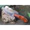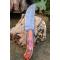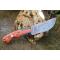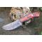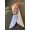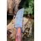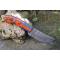 Couteau Damas Skinner 256 couches à lame fixe : Longueur totale 20cm. Longueur de lame 9.5cm. Longueur du tranchant 8.5cm. Lame en acier damas 256 couches. Lame construction plate semelle. Lame de type drop point. Plaquettes du manche en résine. Mosaic pins. Mitres en bois. Étui en simili cuir - Les dessins de la lame sont uniques comme une empreinte - Fabrication artisanale