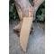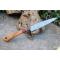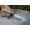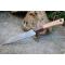 Couteau Damas Skinner 256 couches à lame fixe : Longueur totale 23cm. Longueur de lame 12cm. Lame en acier damas 256 couches. Lame construction plate semelle. Lame de type stylet. Plaquettes du manche en bois d'oliver. Trou pour dragonne. Mitres en bois. Etui en simili cuir - Fabrication artisanale