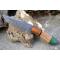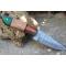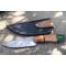 Couteau Skinner à lame fixe - Longueur totale 21cm - Longueur de lame 10.5cm - Lame en acier damas 256 couches - Lame type drop point - Construction d'une seule pièce - Full tang - Plaquettes du manche en 3 bois - Trou pour dragonne - Etui simili cuir - Fabrication artisanale