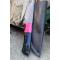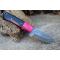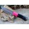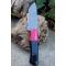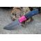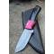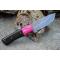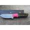 Couteau Skinner à lame fixe - Longueur totale 20.5cm - Longueur de lame 9cm - Lame en acier damas 256 couches - Lame type drop point - Construction d'une seule pièce - Full tang - Plaquettes du manche en résine noir - Trou pour dragonne - Mitres bois fushia - Etui simili cuir - Fabrication artisanale