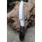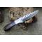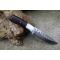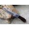Couteau Damas Skinner 256 couches à lame fixe : Longueur totale 15cm. Longueur de lame 8cm. Lame de scie en acier carbone. Lame construction plate semelle. Lame de type drop point. Plaquettes du manche en micarta. Mitres en acier. Trou dans le manche pour dragonne. Etui en simili cuir - Les dessins de la lame sont uniques comme une empreinte - Fabrication artisanale