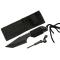 Longueur totale 17.78cm. Longueur de lame 8.57cm. Lame acier inox finition black. Lame de type tanto. Lame construction d'une seule pièce. Manche en corde Black. Bonus : fire starter : Longueur 3.81cm. Etui nylon noir.