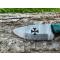 Sont réuni sur ce modèle une lame damas en acier carbone avec découpe EDM (électroérosion) inscrivant un symbole patrimonial français et un manche en corne de bélier muni d'une garde en manche colorée.