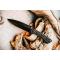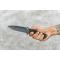 Bonne lame, coupe bien, à la volée comme en utilisation normale. Couteau léger. Le manche n'est pas désagréable le côté carré fait que les gants sont les bienvenus.