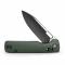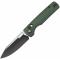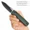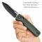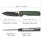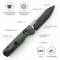 La lame de type Drop Point à tranchant plein est fabriquée en acier 14C28N, un excellent choix pour sa rétention de bord et sa résistance à la corrosion (Dureté : 60±2 HRC). Elle arbore une finition bicolore distinctive : Black Stonewashed et Satiné. L'ouverture est assurée par un système de ouverture flipper fluide, soutenu par un roulement à billes en céramique. Le manche est orné de plaquettes en Micarta Vertes, qui garantissent une prise en main confortable et développent une patine unique avec le temps.