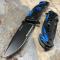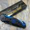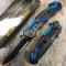 Système à ouverture assistée. Longueur fermé 12,06cm. Longueur de lame 8,25cm. Lame en acier 3Cr13 finition noire. Lame de type drop point partiellement serrated. Manche en Aluminium black & blue. Ouverture d'une main avec le thumb & le flipper. Fonction brise vitres & coupe ceintures. Trou dans le manche pour dragonne. Clip de poche.