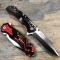 Longueur fermé 11,43cm. Longueur de lame 8,89cm. Système à ouverture assistée. Ouverture d'une main avec le thumb & le flipper. Plaquettes du manche en aluminium rouge. Dessin de scorpion. Fonction brise vitres & cutter. Lame en acier inox partiellement serrated finition 2 tons. Clip de poche.