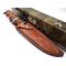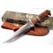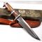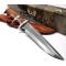 Ce couteau à lame fixe se distingue par sa construction robuste et son esthétique élégante. Le manche en bois offre une prise en main confortable, tandis que la garde et le pommeau en métal ajoutent à la solidité de l'ensemble. L'étui en cuir permet un transport sécurisé et pratique.