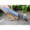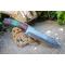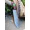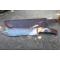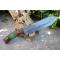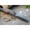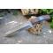 Longueur totale 28cm. Longueur de lame 18cm. Lame en acier damas 256 couches. Beaux dessins damas bubble. Lame de type tanto californien. Dos de la lame guilloché. Lame construction plate semelle. Plaquettes du manche en 3 bois. Garde dans la lame. Etui cuir.