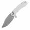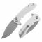 Le manche est usiné dans un bloc d'Aluminium 6061-T6 Gris Argent, offrant un aspect métallique pur tout en conservant une légèreté incroyable pour un couteau de cette taille (115 g). Le système Button Lock assure une manipulation fluide et sécurisée : la lame se déverrouille par simple pression, permettant une fermeture rapide d'une seule main. Les roulements à billes en céramique et le Thumb Stud garantissent un déploiement instantané.