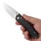 Ce couteau a une longueur totale de 19,234 cm une fois ouvert, avec un manche d'environ 11,26 cm. Le manche est fabriqué à partir de fibre de carbone Twill laminée sur G10, offrant non seulement un aspect visuel unique et sophistiqué mais aussi une durabilité exceptionnelle et une prise en main confortable. Le contour du manche, inspiré par la tête du corbeau, est conçu pour une tenue sécurisée et agréable, adaptée à une utilisation prolongée.