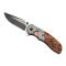 Couteau THIRD, lame acier inox 420 finition « blackwash » avec « flipper », système d'ouverture assistée et cran intérieur, manche 12 cm acier anodisé orange avec plaquettes bois décor gravé cerf, mitres inox avec découpe tête de cerf.