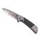 Couteau THIRD, lame acier inox 420 avec « flipper », bouton double, système d'ouverture assistée et cran intérieur, manche 11,5 cm acier inox gris et noir avec platines anodisées bleues. Impression 3D décor damas.